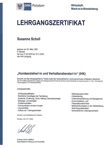 Aufgewachsen bin ich mit Schäferhunden. Als ich dann flügge wurde und nach Hamburg zog, war mir klar, dass ein Leben ohne Hund zwar möglich ist, mich aber nicht 100% glücklich macht. Mein Wunsch nach einem eigenen Hund konnte ich mir dann erfüllen,als ich 28 Jahre alt war. Damals zog unsere kleine Staffordshire Bullterrier Hündin Pepper bei uns ein und stellte unser komplettes Leben auf den Kopf. In der Welpenschule war sie eine Musterschülerin, als dann aber die Pubertät kam und sie leider schlechte Erfahrungen mit Hunden machte, änderte sich ihre unbeschwerte Art und sie ging lieber jeden Hund aus dem Weg. Half das nichts, ging sie in die Offensive und zeigte aggressives Verhalten. Auch ich war damals noch grün hinter den Ohren was Hundeverhalten betraf. So schlug es mich von Hundetrainer zu Hundetrainer bis ich dann eine Trainerin fand, die mir erklären konnte, warum mein Hund das tut, was sie tut und wie wir das in den Griff bekommen. Ich war damals so fasziniert, dass ich unbedingt mehr über Hundeverhalten lernen wollte. So fing ich an Bücher zu lesen, mir Webinare anzuschauen, habe angefangen ehenamtlich im Tierheim zu arbeiten (was ich bis heute tu) und habe letztendlich eine Ausbildung zur Hundeverhaltensberaterin bei der IHK Potsdam absolviert.